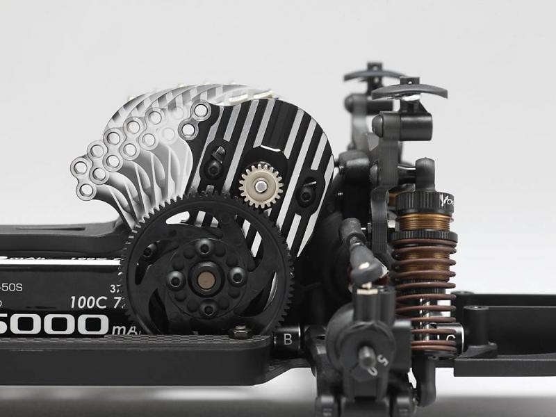●7 段階に位置調整可能なアルミ製スペシャル モーターマウントで細やかな重量バランスを調整し、ブッシュインサートのアルミ製サスマウントが最適なサスアライメントを提供。